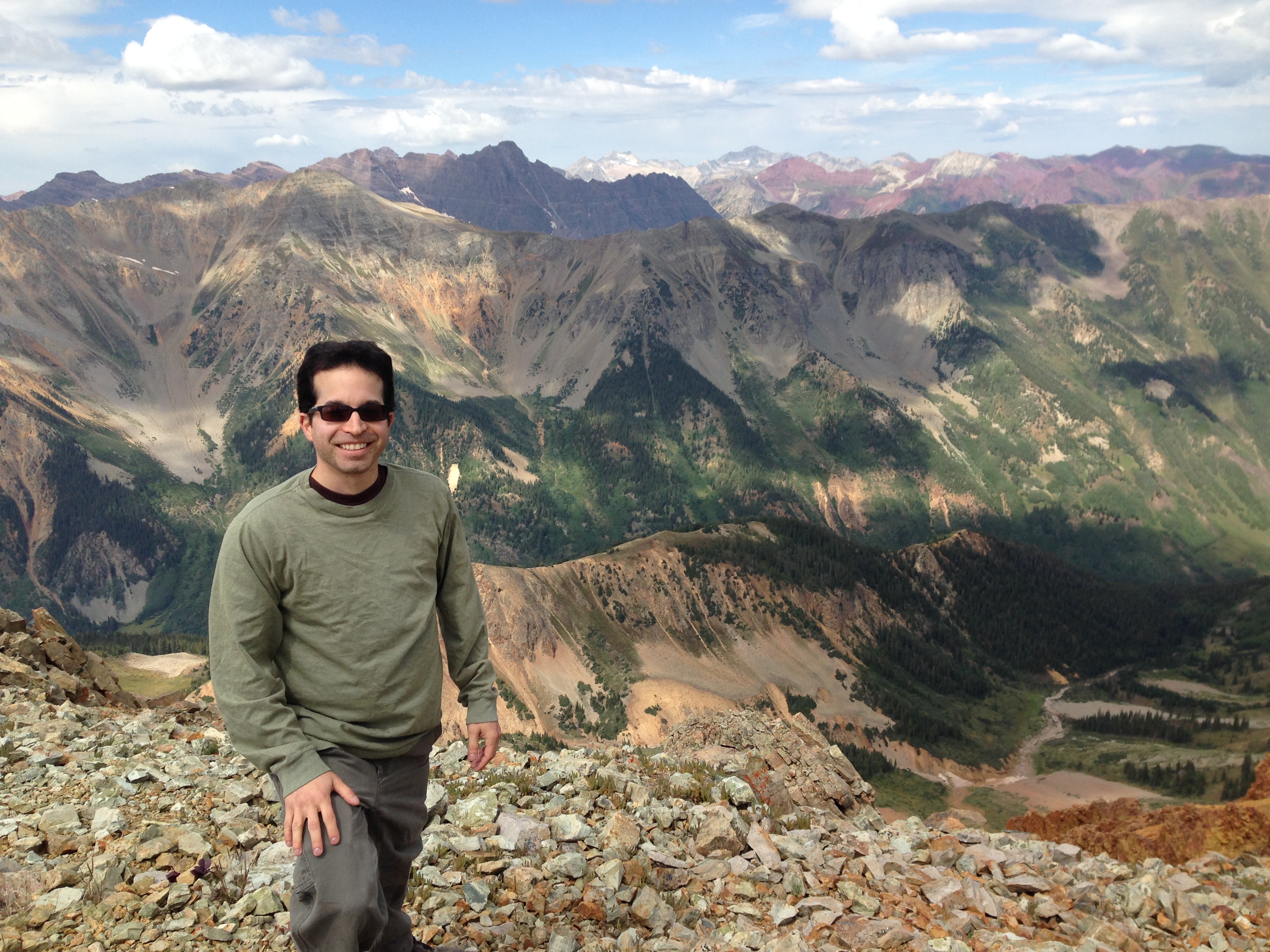 Since I grew up in Colorado, I have to add that Aspen is fine and I understand why it’s popular, but there are many beautiful mountain towns in the Colorado Rockies. Visitors and businesses should spread the love to other places too, like Glenwood Springs, Durango, Leadville, Estes Park, etc… In any case, when we had time off, it was fun to go hiking and biking in the area. For example, I took the following photo after hiking to the top of Electric Peak (elev. 13635 ft., 4155 m), and lower down I’ve included photos of Lost Man Lake (near the continental divide) and the iconic Maroon Bells.